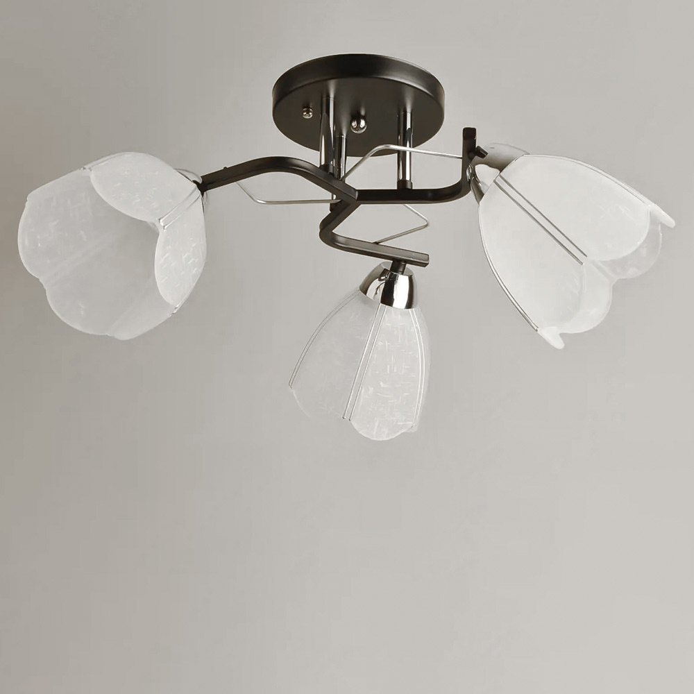 Стельова люстра в сучасному стилі на три плафони форми квітки які розсіюють світло рівномірно і створюють приємну атмосферу, має стильний і сучасний дизайн, що надає шарму і елегантності вашому простору. Вона підходить для різних інтер'єрів, чи то сучасний, класичний чи інший стиль.