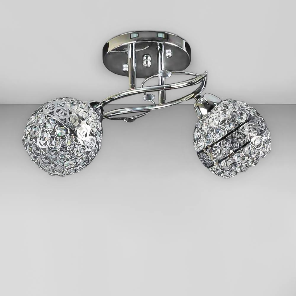 Сучасна стельова люстра на дві лампи, оснащена металевими плафонами круглої форми з кришталевими вставками: що забезпечить вишуканий блиск і створить цікаву гру світла та тіні при включеному джерелі світла.
