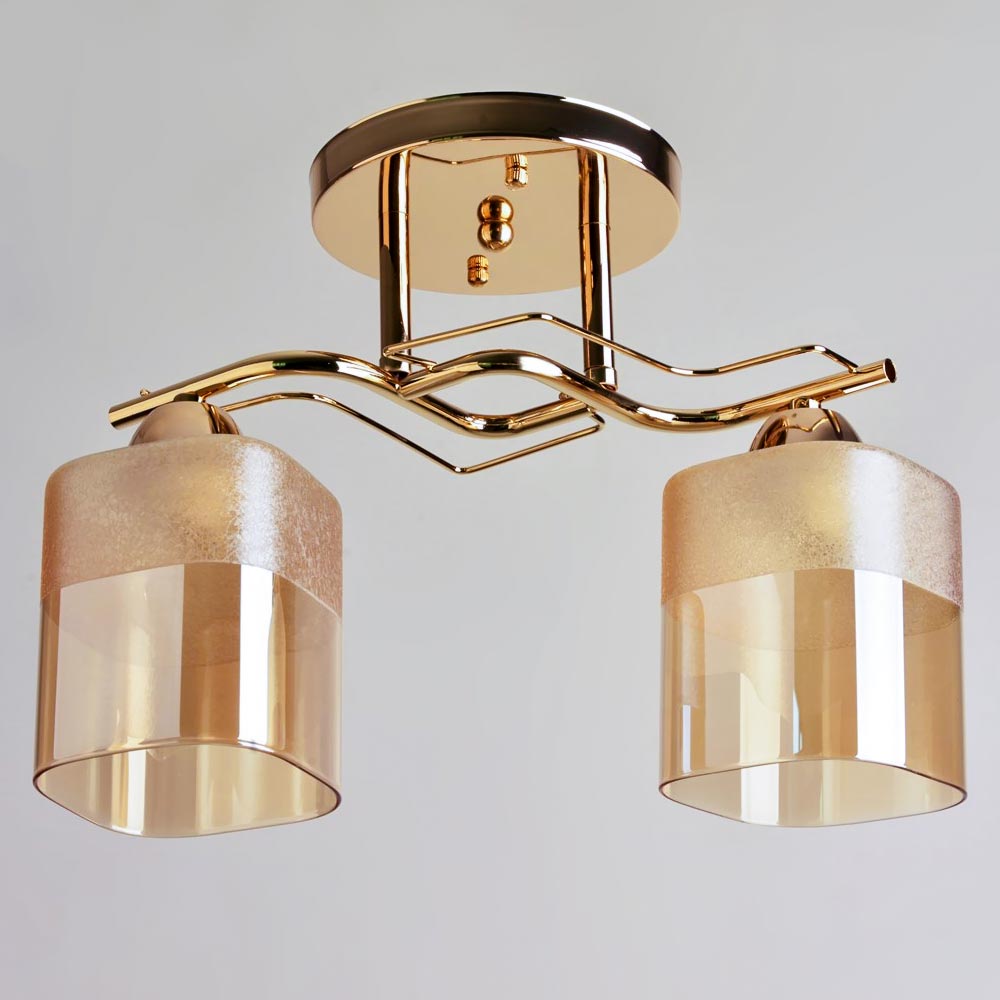 Стельова люстра оснащена двома скляними плафонами прямокутної форми, які розсіюють світло рівномірно і створюють приємну теплу атмосферу. Люстра має стильний та сучасний дизайн, що надає шарму та елегантності вашому простору. Вона підходить для різних інтер'єрів, чи то сучасний, класичний чи інший стиль.