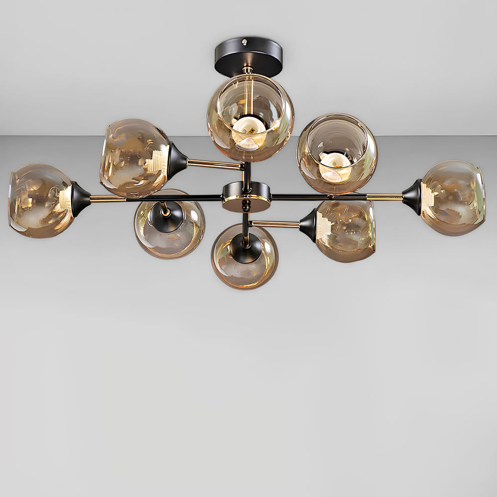 Стельова люстра на вісім ламп зі скляними плафонами. Плафони прозоро-золотого кольору, мають круглу форму.