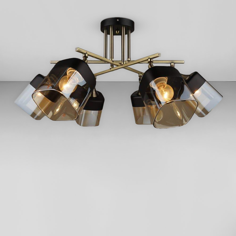 Люстра стельова на шість лампи зі скляними плафонами прямокутної форми, які розсіюють світло рівномірно і створюють приємну атмосферу, має стильний і сучасний дизайн, що надає шарму та елегантності вашому простору. Вона підходить для різних інтер'єрів, чи то сучасний, класичний чи інший стиль.