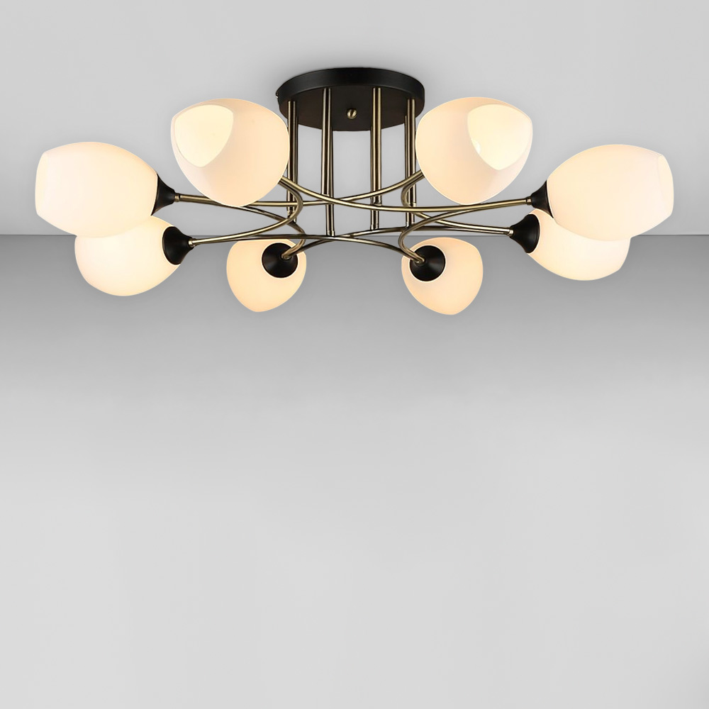 Люстра стельова на вісім ламп зі скляними плафонами овальної форми, які розсіюють світло рівномірно і створюють приємну атмосферу, має стильний і сучасний дизайн, що надає шарму та елегантності вашому простору. Вона підходить для різних інтер'єрів, чи то сучасний, класичний чи інший стиль.