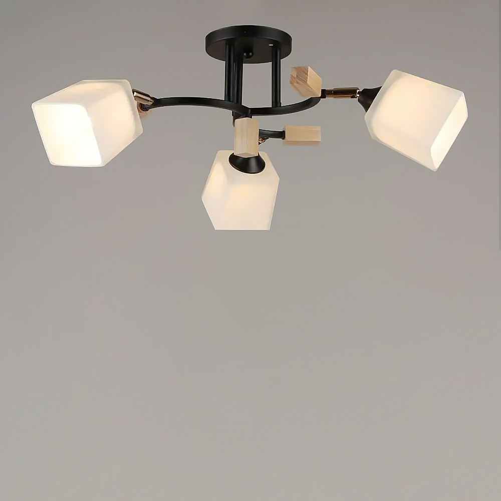Стельова люстра з дерев'яними елементами на три скляні декоративні плафони прямокутної форми з поворотним механізмом.