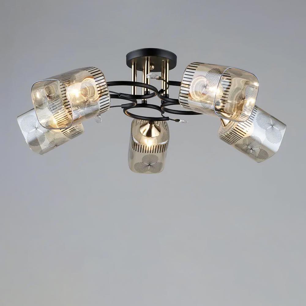 Стильна стельова люстра на п'ять ламп зі скляними плафонами з візерунком.