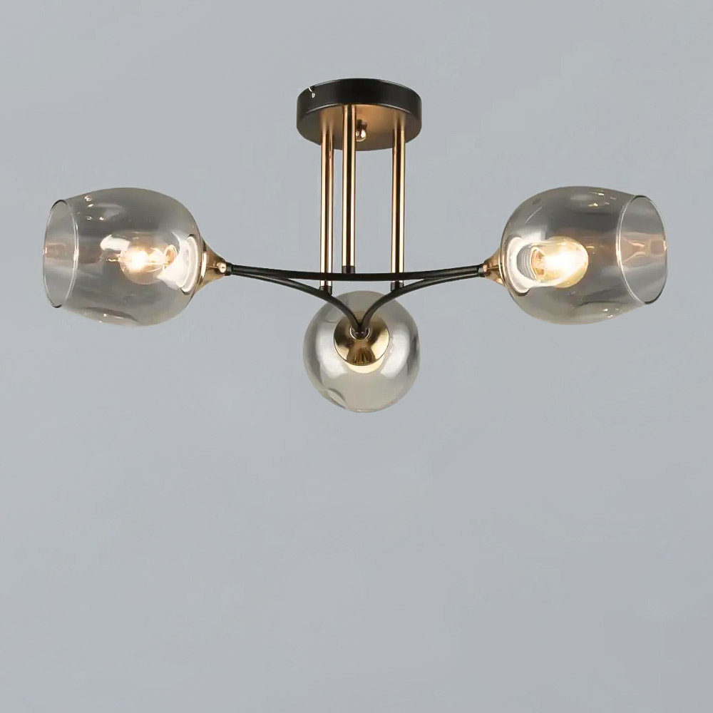 Стильна стельова люстра на три лампи зі скляними фігурними плафонами.