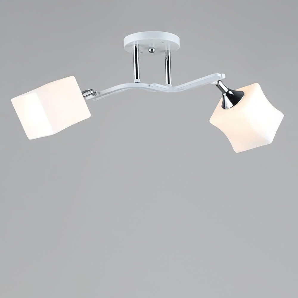 Стильна стельова люстра на дві лампи зі скляними поворотними плафонами квадратної форми.