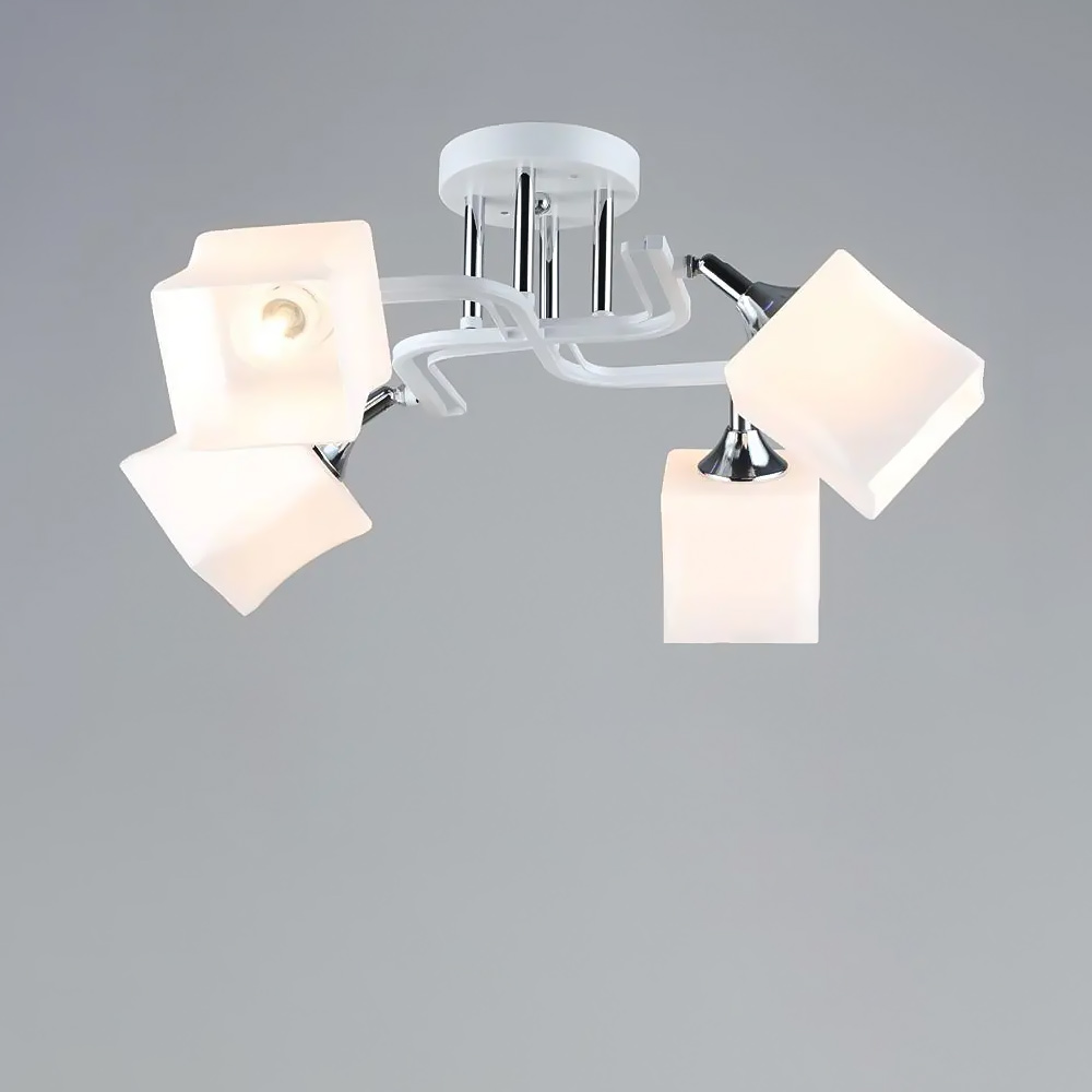 Стильна стельова люстра на чотири лампи зі скляними поворотними плафонами квадратної форми.
