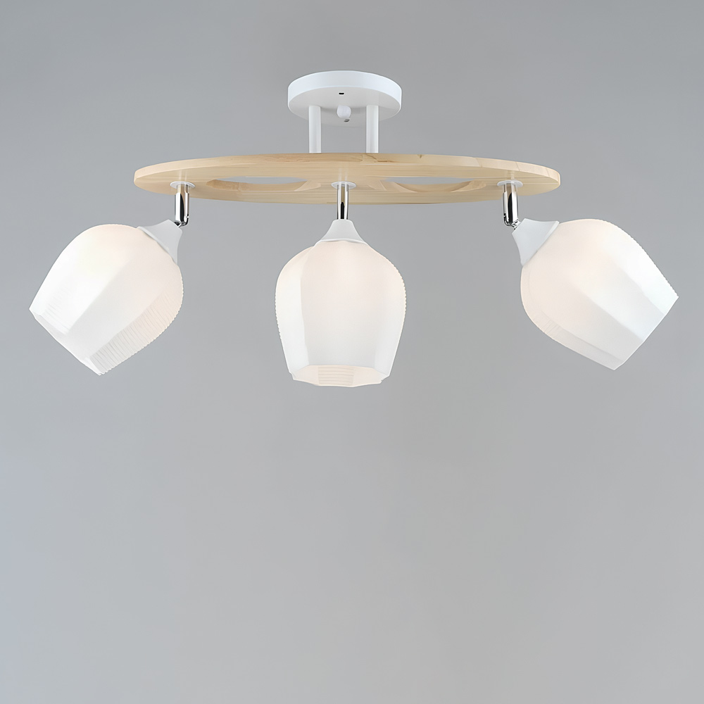 Стильна стельова люстра на три лампи зі скляними поворотними плафонами та дерев'яним корпусом.