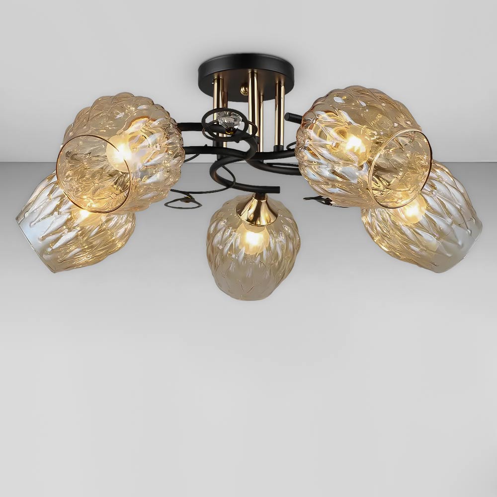 Стильна стельова люстра на п'ять ламп зі скляними плафонами з рифленою поверхнею.