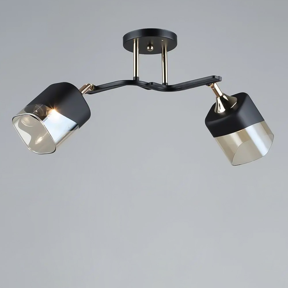 Стильна стельова люстра на дві лампи зі скляними плафонами прямокутної форми з поворотним механізмом.