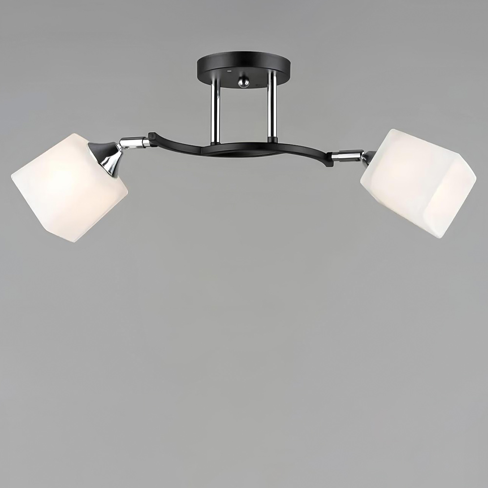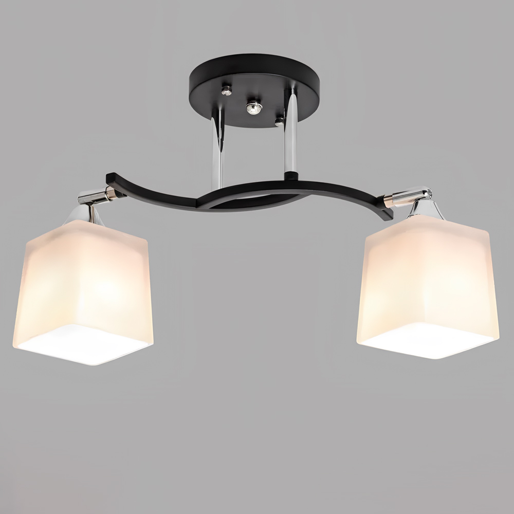 Стельова люстра на дві лампи зі скляними плафонами з поворотним механізмом. Плафони білі матові, мають прямокутну форму. У поєднанні чорного матового металу та блиску хрому ідеально впишеться у сучасні інтер'єри.