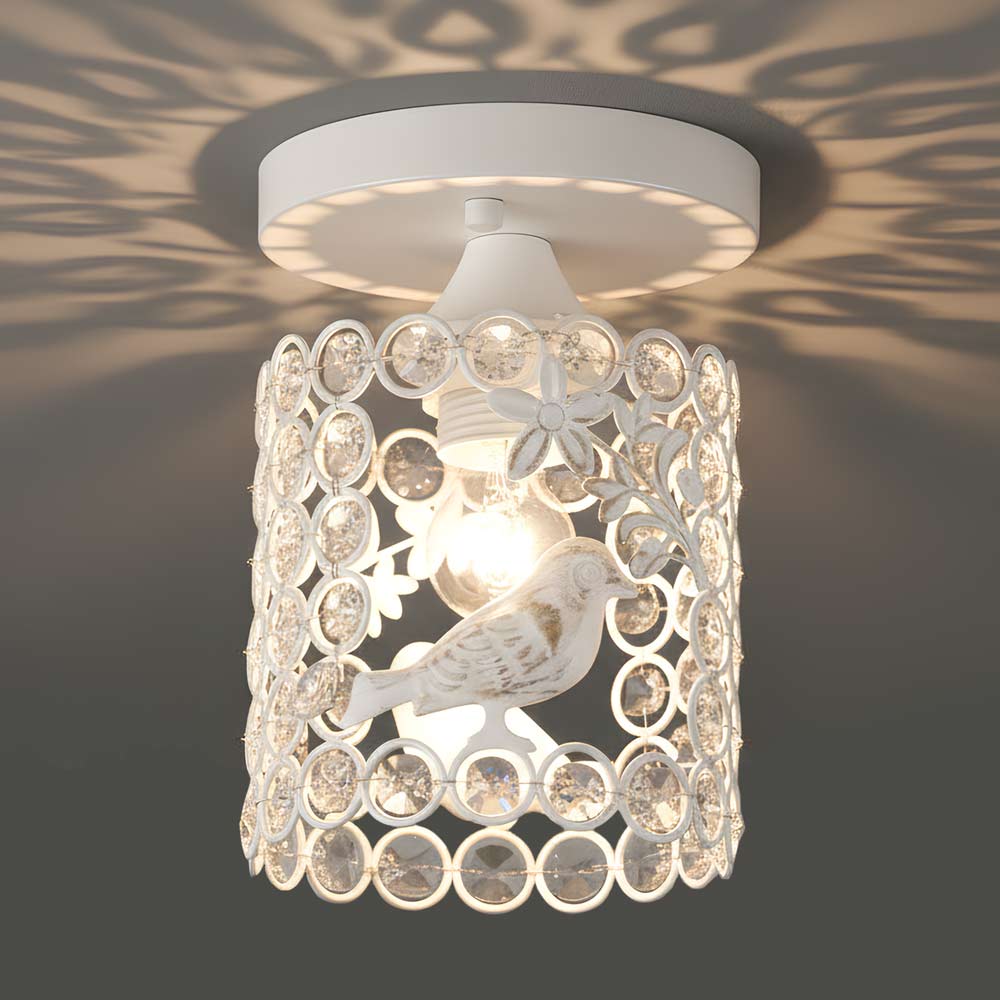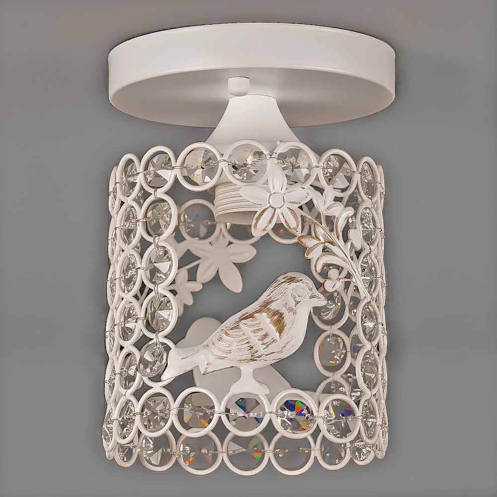 Сучасна компактна стельова люстра на одну лампу, оснащена металевим плафоном циліндричної форми з декоративними фігурками пташок та кришталевими вставками: що забезпечить вишуканий блиск і створить цікаву гру світла та тіні при включеному джерелі світла. Найкраще ця люстра підійде для освітлення до 3 м² приміщення, при використанні лампочок 6 Вт (LED) або 60 Вт (стандартна), буде актуальна для приміщень з невисокими стелями. Може застосовуватися для локального освітлення, або як додаткове джерело світла.