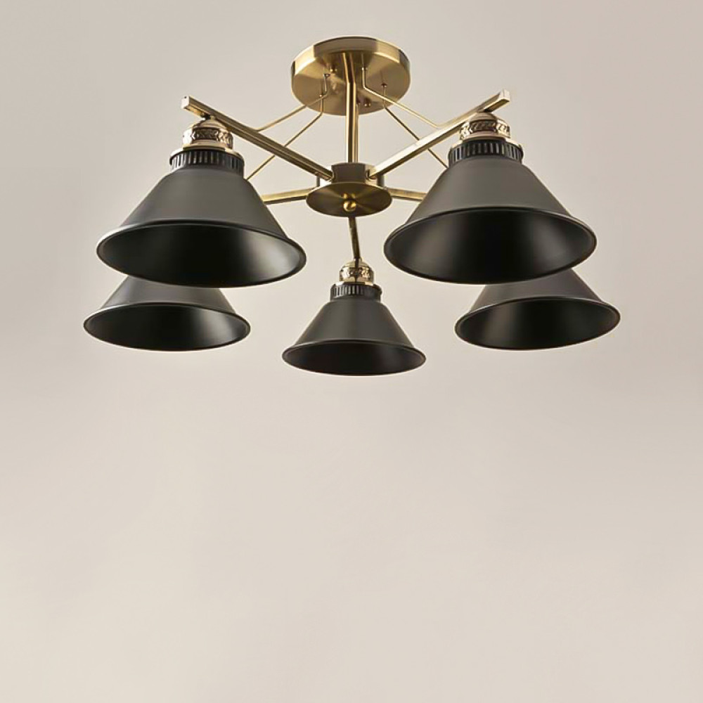 Люстра стельова на п'ять ламп з плафонами конусної форми з металу.