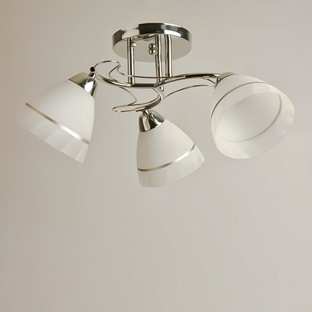 Стельова люстра на три лампи зі скляними плафонами, які розсіюють світло рівномірно і створюють приємну атмосферу, має стильний і сучасний дизайн, що надає шарму та елегантності вашому простору. Вона підходить для різних інтер'єрів, чи то сучасний, класичний чи інший стиль.