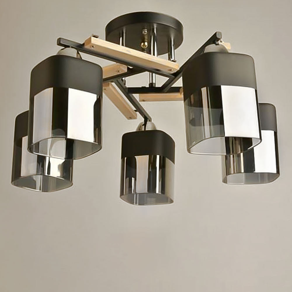 Люстра стельова з елементами дерева, на п'ять ламп зі скляними плафонами, які розсіюють світло рівномірно і створюють приємну атмосферу, має стильний і сучасний дизайн, що надає шарму та елегантності вашому простору. Вона підходить для різних інтер'єрів, чи то сучасний, класичний чи інший стиль.
