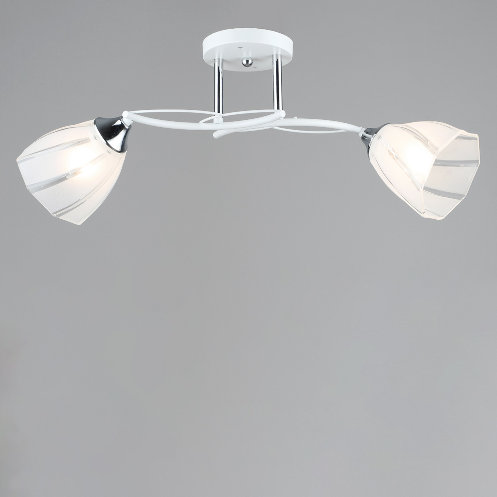 Стельова люстра на дві лампи зі скляними декоративними плафонами конусної форми, які розсіюють світло рівномірно і створюють приємну атмосферу, має стильний і сучасний дизайн, що надає шарму та елегантності вашому простору. Вона підходить для різних інтер'єрів, чи то сучасний, класичний чи інший стиль.