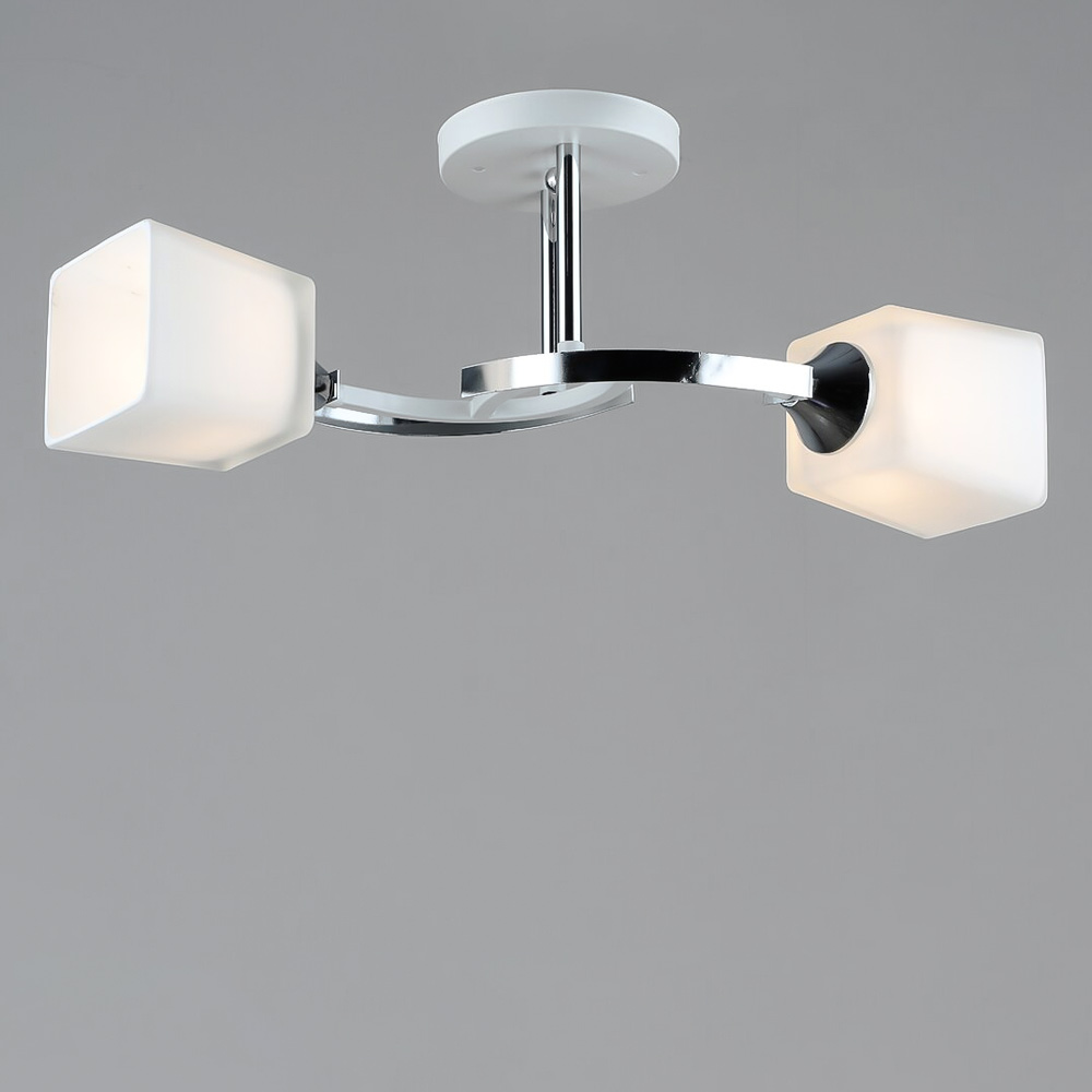 Люстра стельова на дві лампи зі скляними декоративними плафонами прямокутної форми, які розсіюють світло рівномірно і створюють приємну атмосферу, має стильний та сучасний дизайн, що надає шарму та елегантності вашому простору. Вона підходить для різних інтер'єрів, чи то сучасний, класичний чи інший стиль.