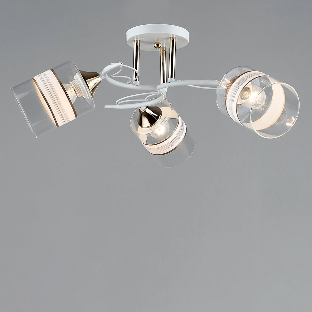 Стельова люстра, на три лампи з плафонами із прозорого скла з білою та золотими смужками, вони розсіюють світло рівномірно та створюють приємну атмосферу, має стильний та сучасний дизайн, що надає шарму та елегантності вашому простору. Вона підходить для різних інтер'єрів, чи то сучасний, класичний чи інший стиль.