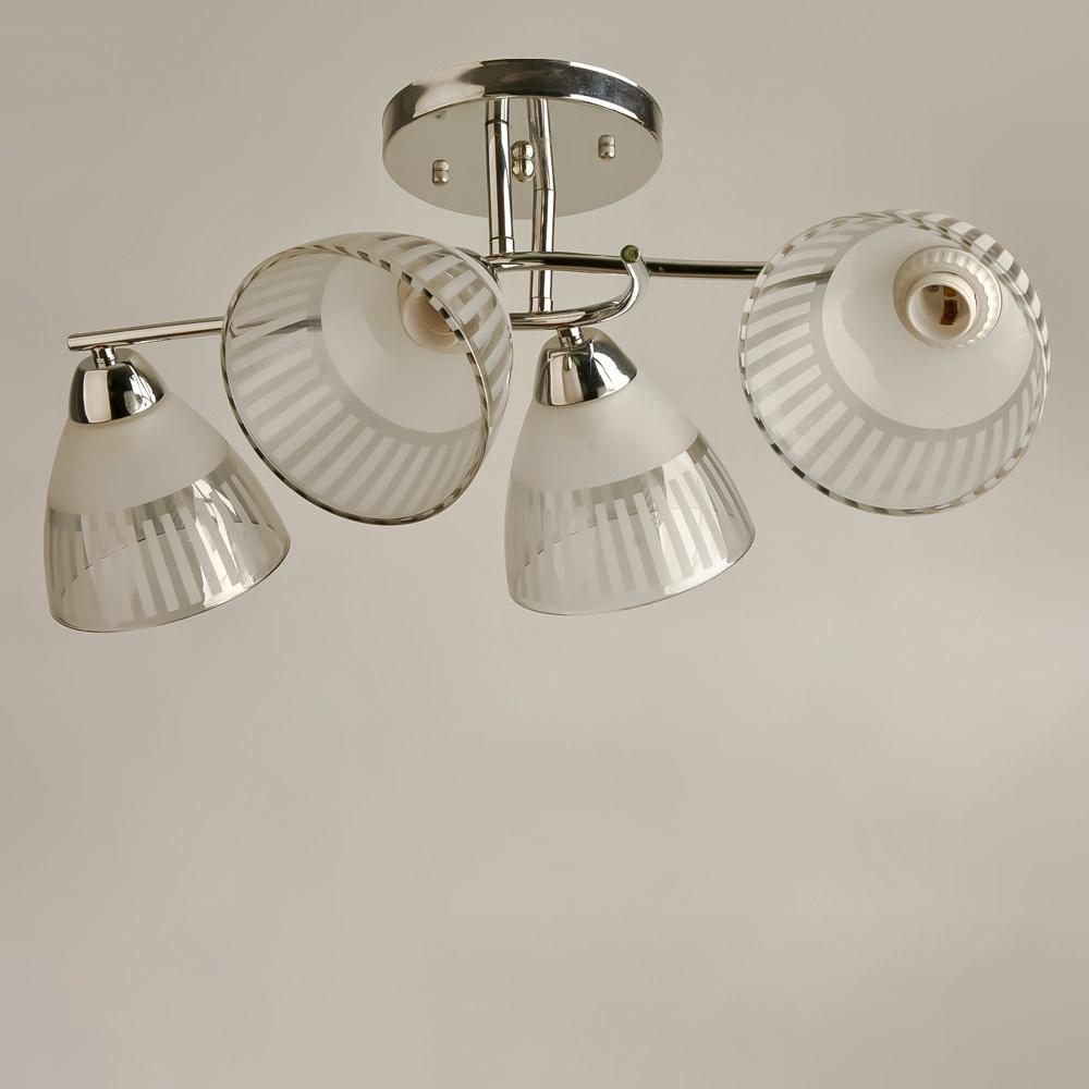 Стельова люстра на чотири лампи зі скляними декоративними плафонами конусної форми, які розсіюють світло рівномірно і створюють приємну атмосферу, має стильний і сучасний дизайн, що надає шарму та елегантності вашому простору. Вона підходить для різних інтер'єрів, чи то сучасний, класичний чи інший стиль.