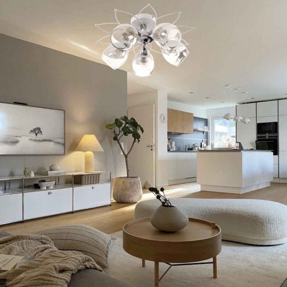 Люстра стельова на п'ять плафонів з поворотним механізмом, які розсіюють світло рівномірно і створюють приємну атмосферу, має стильний і сучасний дизайн, що надає шарму та елегантності вашому простору. Вона підходить для різних інтер'єрів, чи то сучасний, класичний чи інший стиль.