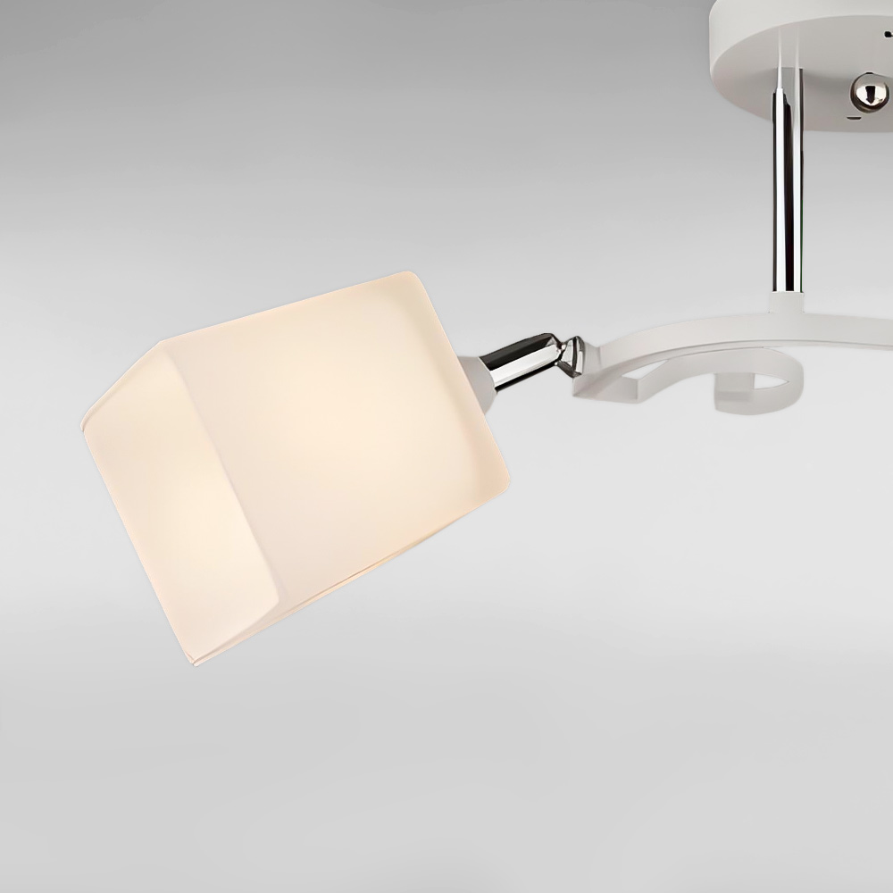 Каркас виготовлений з металу в білому та хромовому кольорі, що надає люстру сучасного та стильного вигляду. Два білих плафони зі скла квадратної форми створюють вишуканість до дизайну.