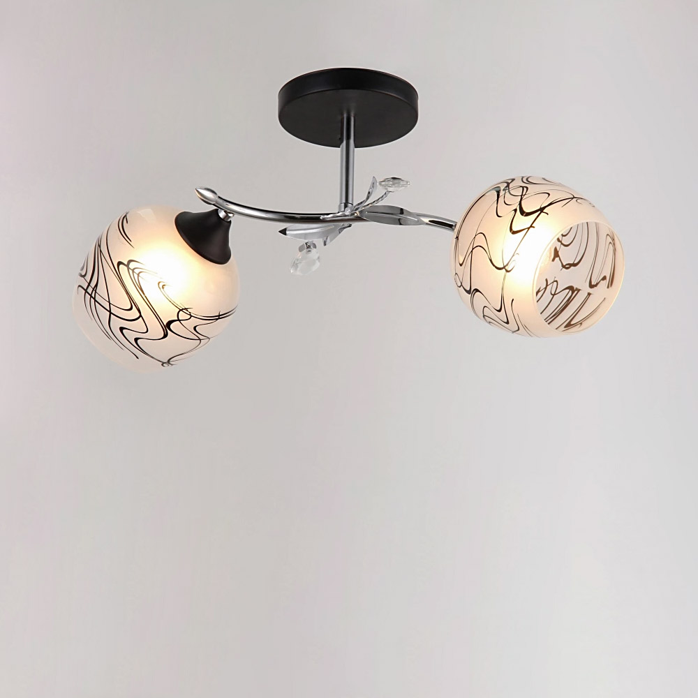 Стильна стельова люстра на дві лампи із скляними плафонами круглої форми.