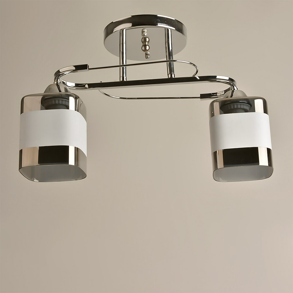 Два плафони зі скла з білим відтінком та хромовими лініями створюють захоплюючий дизайн, дозволяючи світлу рівномірно розподіляти світло по всьому простору. Цоколь E27 дозволяє використовувати лампочки потужністю до 60 Ватт, забезпечуючи достатнє освітлення для вашого приміщення.