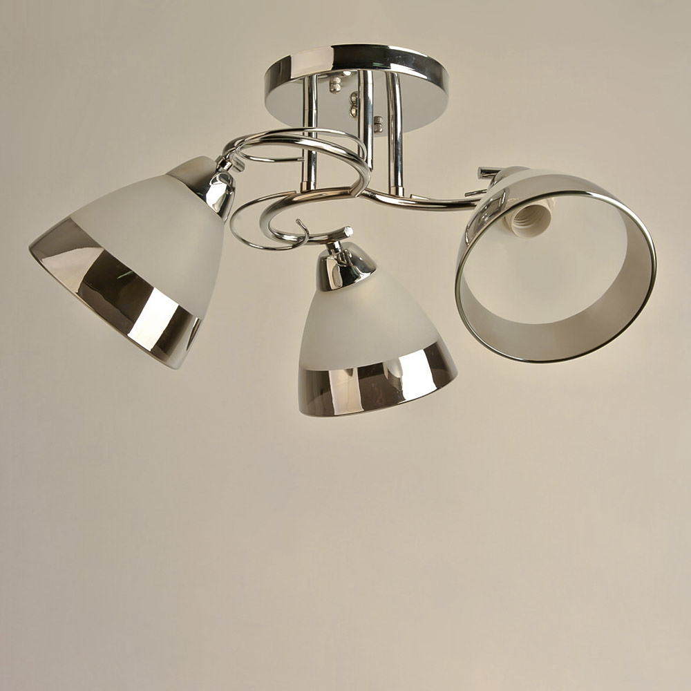 Її каркас виготовлений із міцного металу у відтінку хрому, що надає їй сучасного та стильного вигляду. Три плафони зі скла мають білий відтінок із хромовими лініями, створюючи захоплюючий інтер'єрний акцент. Люстра розсіює світло рівномірно, забезпечуючи комфортне освітлення у приміщенні.