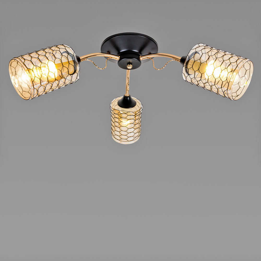 Стильна стельова люстра на три лампи зі скляними плафонами циліндричної форми із декоративною сіткою.
