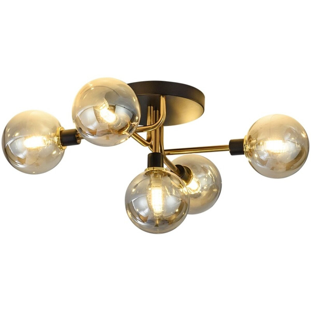 Стильна стельова люстра на п'ять лампи зі скляними плафонами форми кулі.