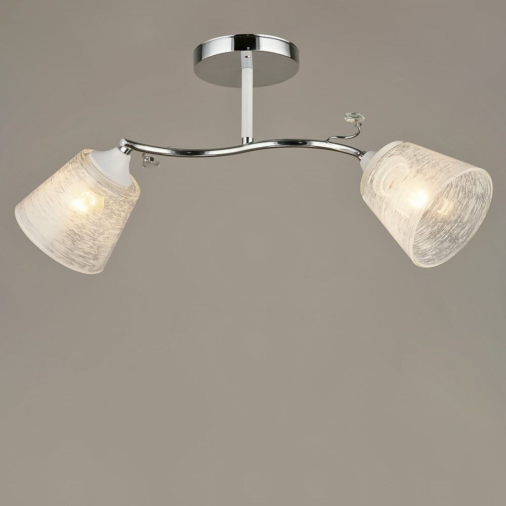 Каркас із металу в хромовому кольорі надає люстру вишуканості та сучасного шарму. 2 плафони з білого скла розсіюють світло рівномірно, створюючи приємну та затишну атмосферу.