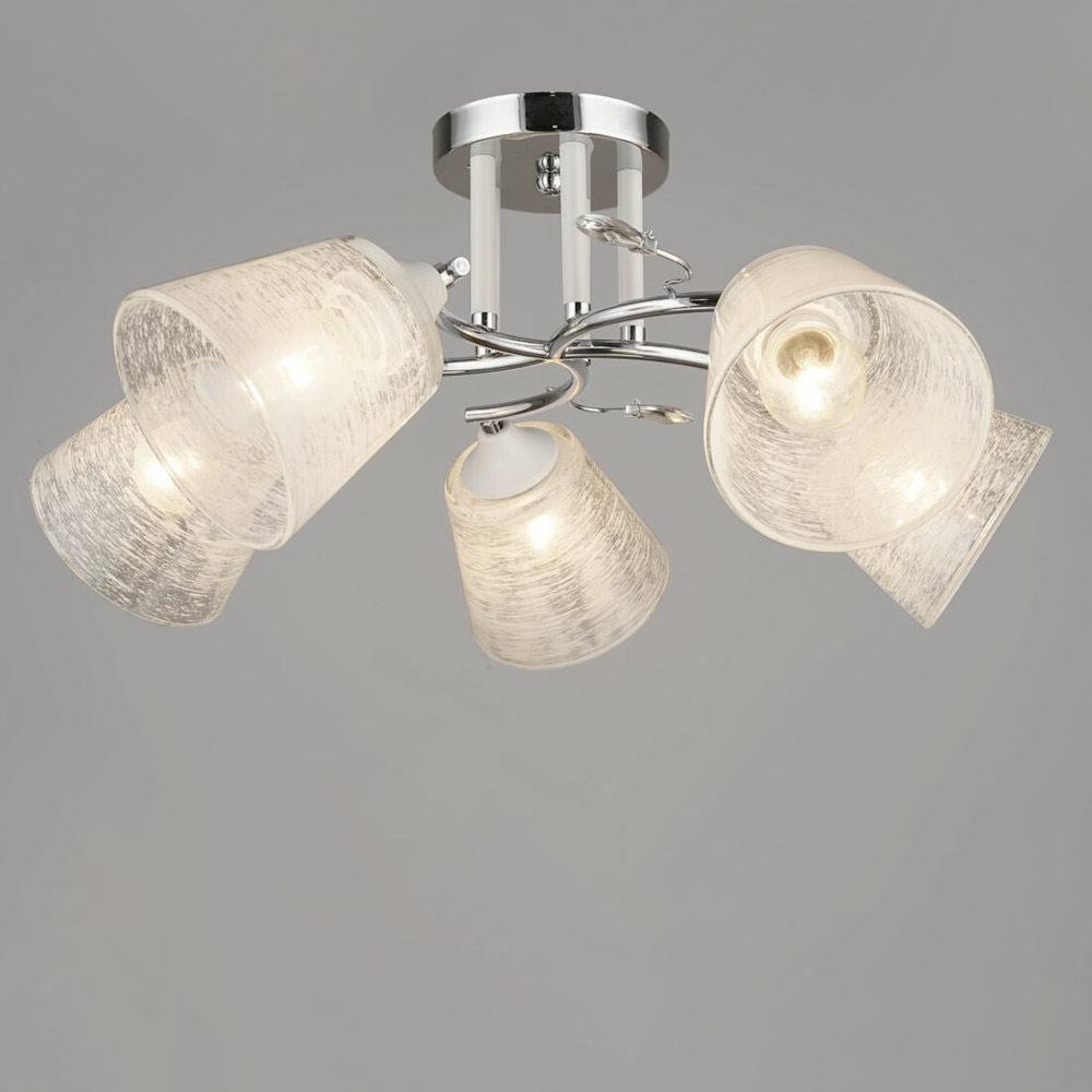 Каркас із металу в хромовому кольорі надає люстру вишуканості та сучасного шарму. П'ять плафонів із білого скла розсіюють світло рівномірно, створюючи приємну та затишну атмосферу.