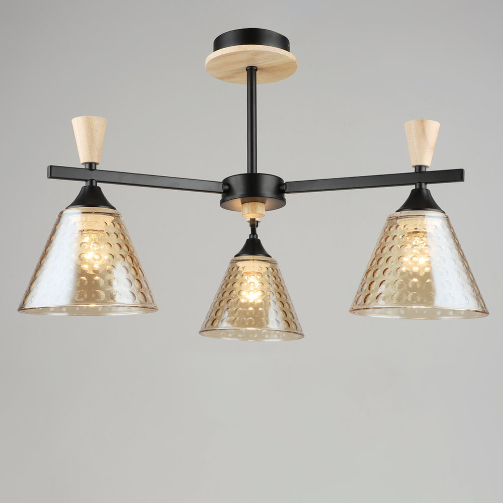 Стильна стельова люстра на три лампи зі скляними плафонами конусної форми та дерев'яними елементами.