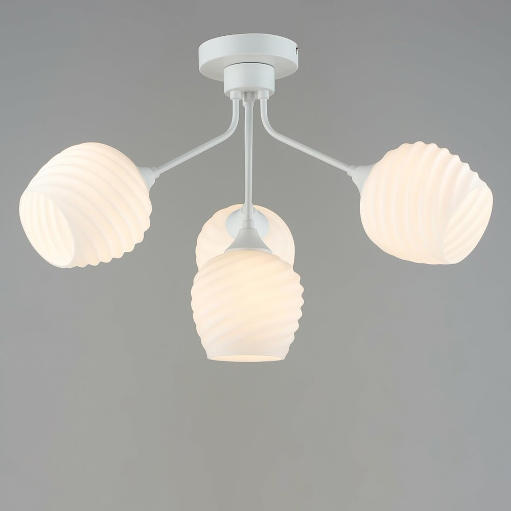 Люстра оснащена чотирма скляними плафонами, що рівномірно розсіюють світло, створюючи м'яку та затишну атмосферу.