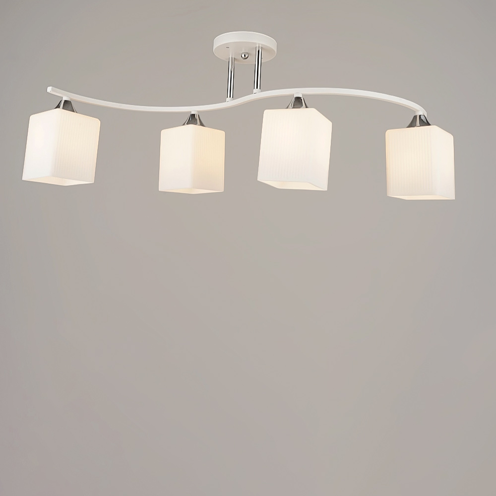 Каркас виготовлений з металу в білому та хромовому кольорі, що надає люстру сучасного та стильного вигляду. Чотири білих плафона квадратної форми, надають вишуканості до дизайну.