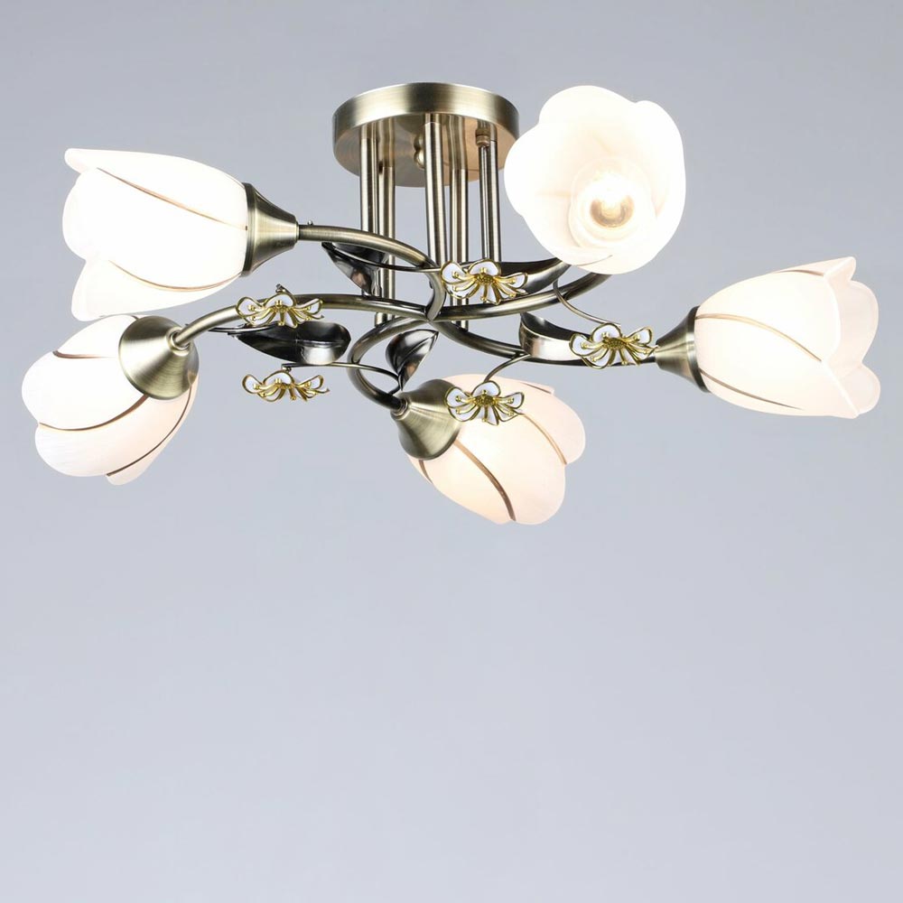 Витончена люстра з бронзовим каркасом та скляними плафонами у формі квіток. Такий дизайн створює затишну атмосферу у будь-якому приміщенні, надаючи інтер'єру елегантності. Плафони у вигляді квіточок надають люстру ніжного вигляду, а відсутність лампочок у комплекті дозволяє вибрати світлову температуру на власний смак.