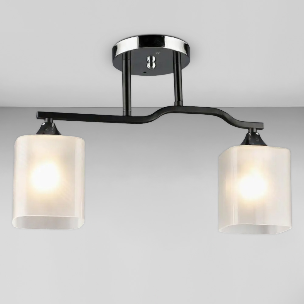 Стельова люстра на дві лампи зі скляними плафонами. Плафони матового білого кольору, мають прямокутну форму.