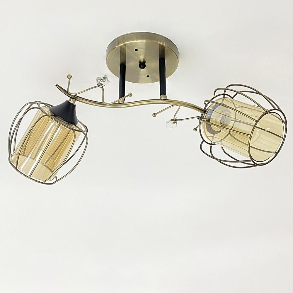 Люстра стельова в стилі Лофт на дві лампи з подвійними плафонами: зовнішня частина плафона виконана у вигляді металевої клітини округлої форми, внутрішній плафон зі скла циліндричної форми. Така незвичайна конструкція створює цікаву гру світла і тіні при включеному джерелі світла і забезпечить ідеальне доповнення до інтер'єру. Найкраще підійде у приміщенні загальною площею 6 м² при використанні ламп 6 Вт (LED) або 60 Вт (стандартна).