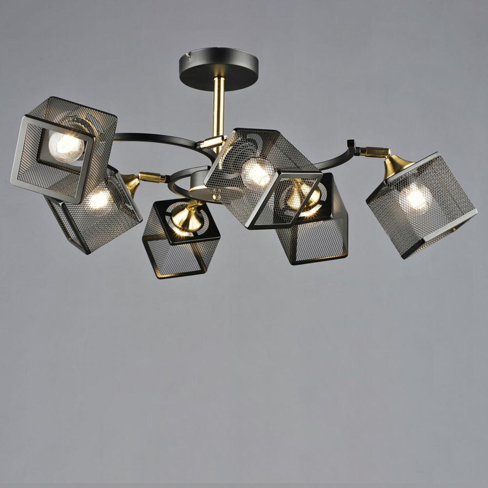 Стильна стельова люстра на шість ламп із металевими плафонами кубічної форми, оснащені поворотним механізмом. Грані плафонів виконані у вигляді сітки. Найкраще ця люстра підійде для освітлення до 18 м² приміщення, при використанні лампочок 6 Вт (LED) або 60 Вт (стандартна), відмінно підходить для невисоких стель.