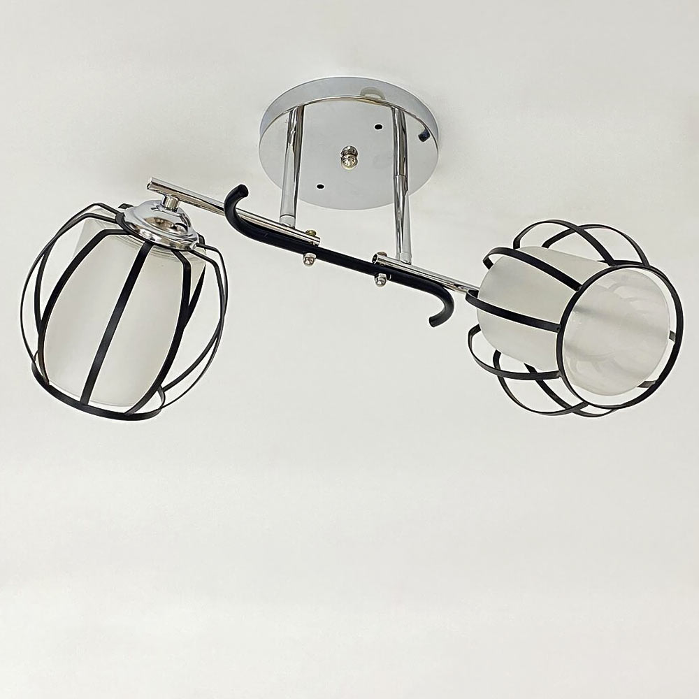Люстра стельова в стилі Лофт на дві лампи з подвійними плафонами: зовнішня частина плафона виконана у вигляді металевої клітки округлої форми, внутрішній плафон зі скла циліндричної форми. Така незвичайна конструкція створює цікаву гру світла і тіні при увімкненому джерелі світла і забезпечить ідеальне доповнення до інтер'єру. Найкраще підійде у приміщенні загальною площею 6 м² при використанні ламп 6 Вт (LED) або 60 Вт (стандартна).