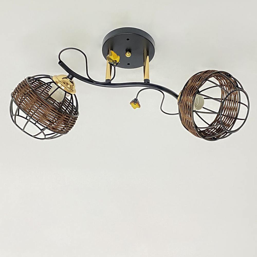 Люстра стельова в стилі Лофт на дві лампи з плафонами сферичної форми. Металеві плафони виконані у вигляді округлої клітки і прикрашені декоративною плетеною лозою: що забезпечує цікаву гру світла і тіні при включеному джерелі світла. Найкраще підійде у приміщенні загальною площею 6 м² при використанні ламп 6 Вт (LED) або 60 Вт (стандартна).
