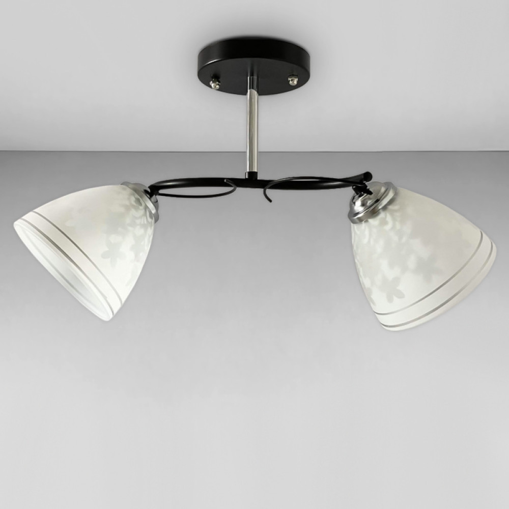 Припотолочна люстра на дві лампи з плафонами конусної форми в сучасному стилі.