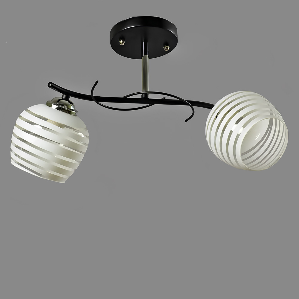 Стильна стельова люстра на дві лампи зі скляними плафонами круглої форми.