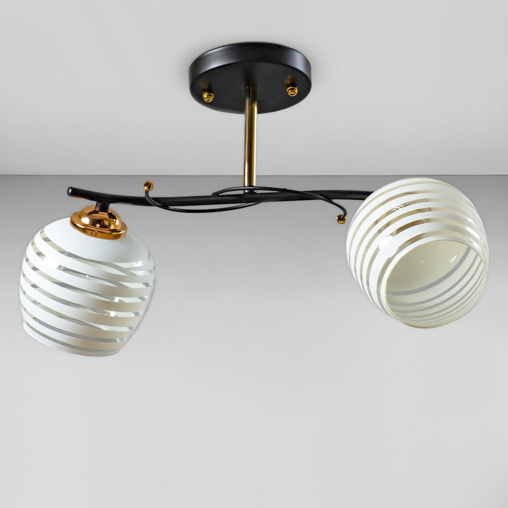Стильна стельова люстра на дві лампи зі скляними декоративними плафонами круглої форми.