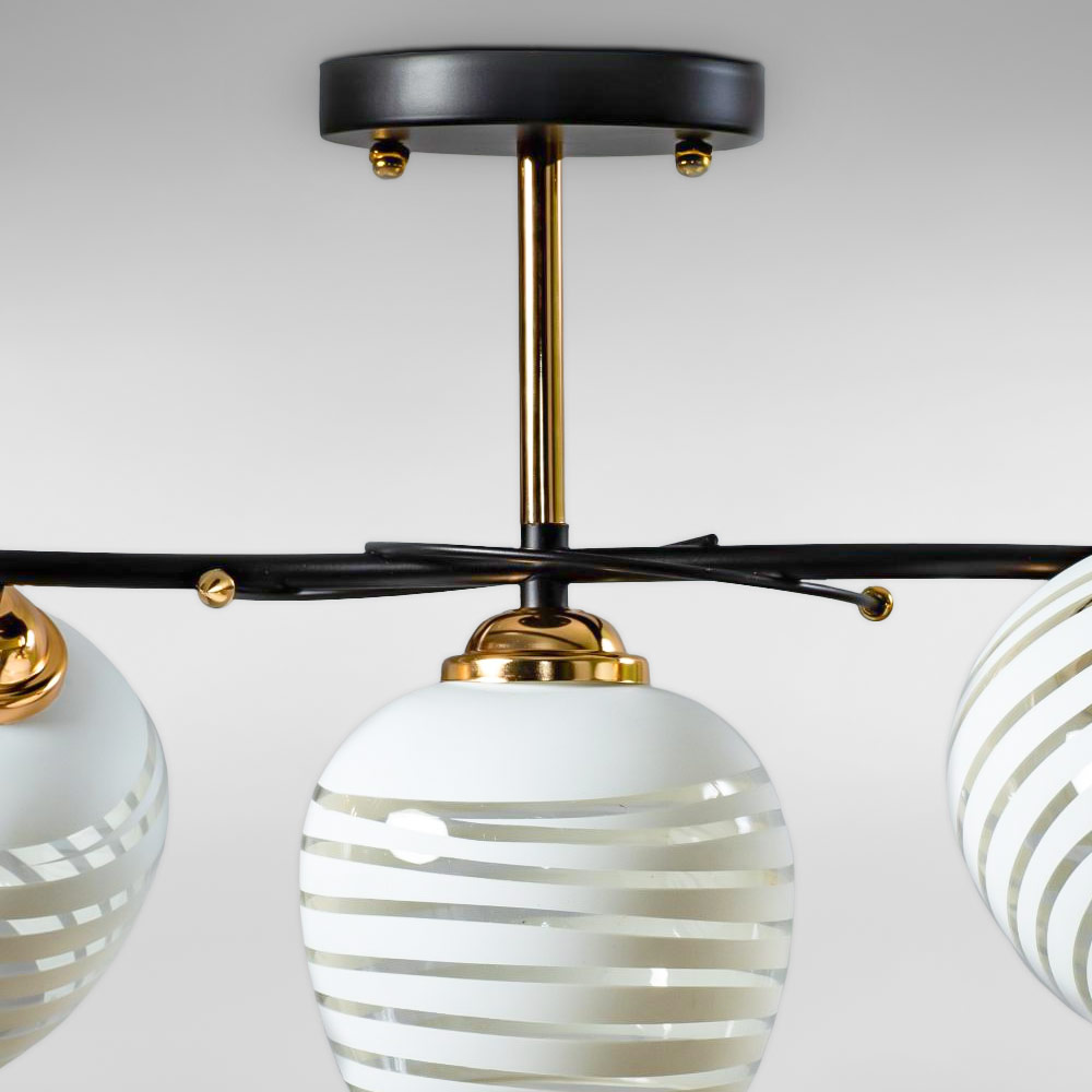 Стильна стельова люстра на три лампи зі скляними декоративними плафонами круглої форми.