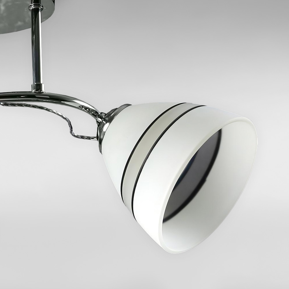 Люстра стельова на два плафони конусної форми, які розсіюють світло рівномірно і створюють приємну атмосферу, має стильний і сучасний дизайн, що надає шарму та елегантності вашому простору. Вона підходить для різних інтер'єрів, чи то сучасний, класичний чи інший стиль.