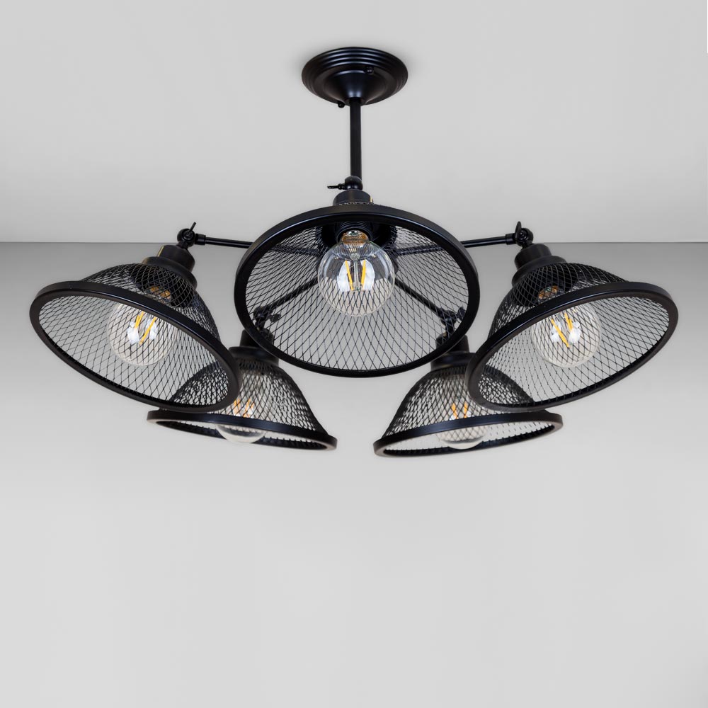 Люстра стельова на п'ять металевих плафонів з поворотним механізмом, які розсіюють світло рівномірно та створюють приємну атмосферу, має стильний та сучасний дизайн, що надає шарму та елегантності вашому простору. Вона підходить для різних інтер'єрів, чи то сучасний, класичний чи інший стиль.
