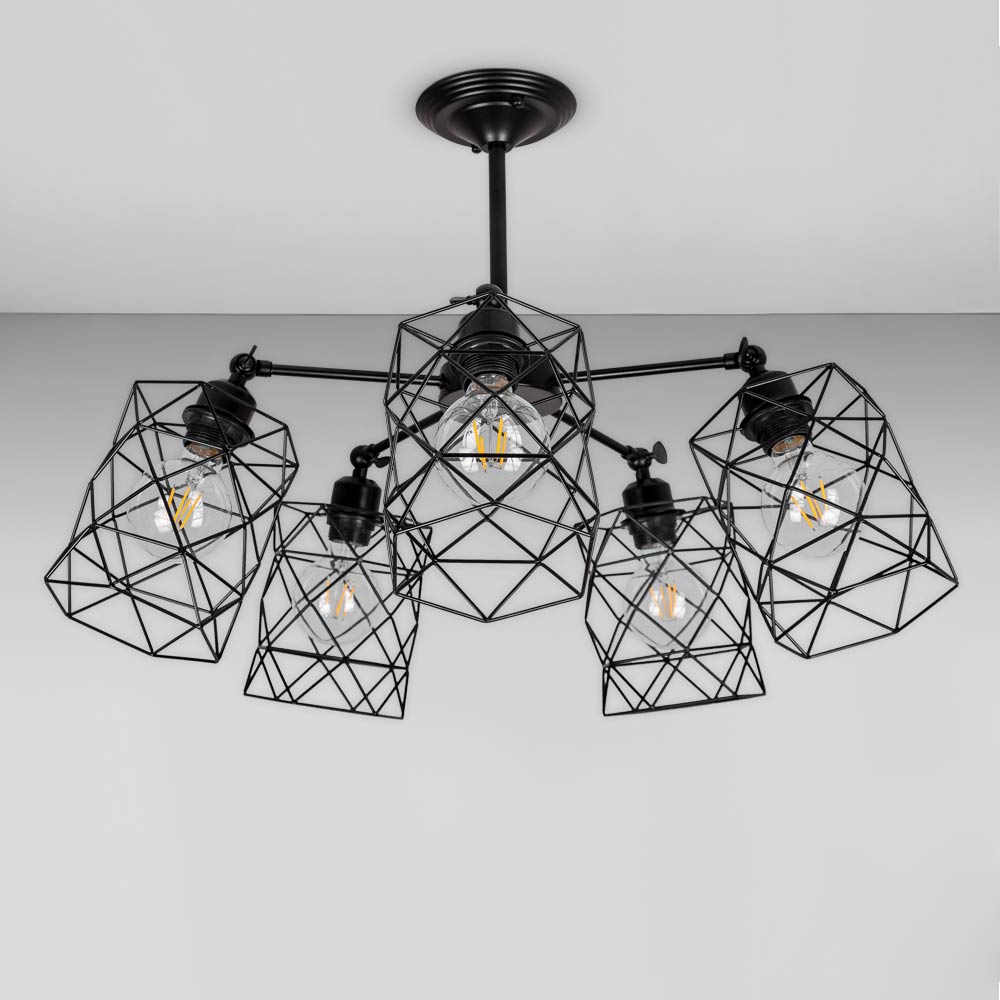 Стельова люстра на п'ять ламп з металевими плафонами з поворотним механізмом, які розсіюють світло рівномірно і створюють приємну атмосферу, має стильний і сучасний дизайн, що надає шарму та елегантності вашому простору. Вона підходить для різних інтер'єрів, чи то сучасний, класичний чи інший стиль.