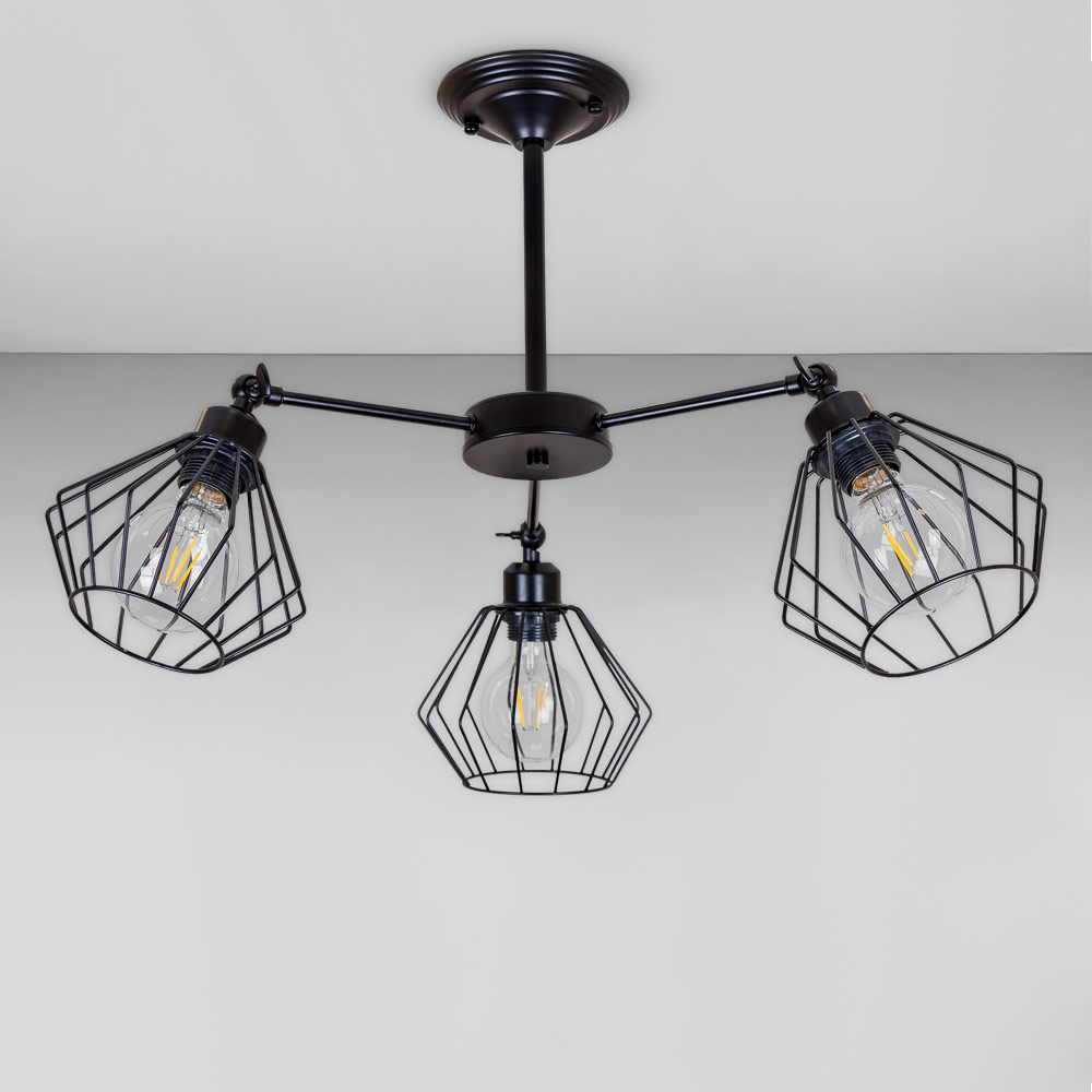 Стельова люстра на три лампи з металевими плафонами з поворотним механізмом, які розсіюють світло рівномірно і створюють приємну атмосферу, має стильний і сучасний дизайн, що надає шарму і елегантності вашому простору. Вона підходить для різних інтер'єрів, чи то сучасний, класичний чи інший стиль.