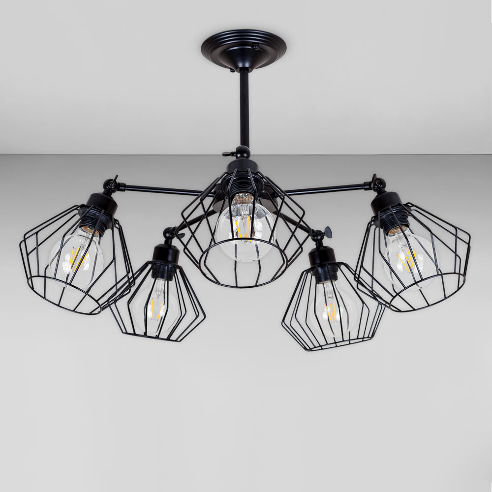 Стельова люстра на п'ять ламп з металевими плафонами з поворотним механізмом, які розсіюють світло рівномірно і створюють приємну атмосферу, має стильний і сучасний дизайн, що надає шарму і елегантності вашому простору. Вона підходить для різних інтер'єрів, чи то сучасний, класичний чи інший стиль.